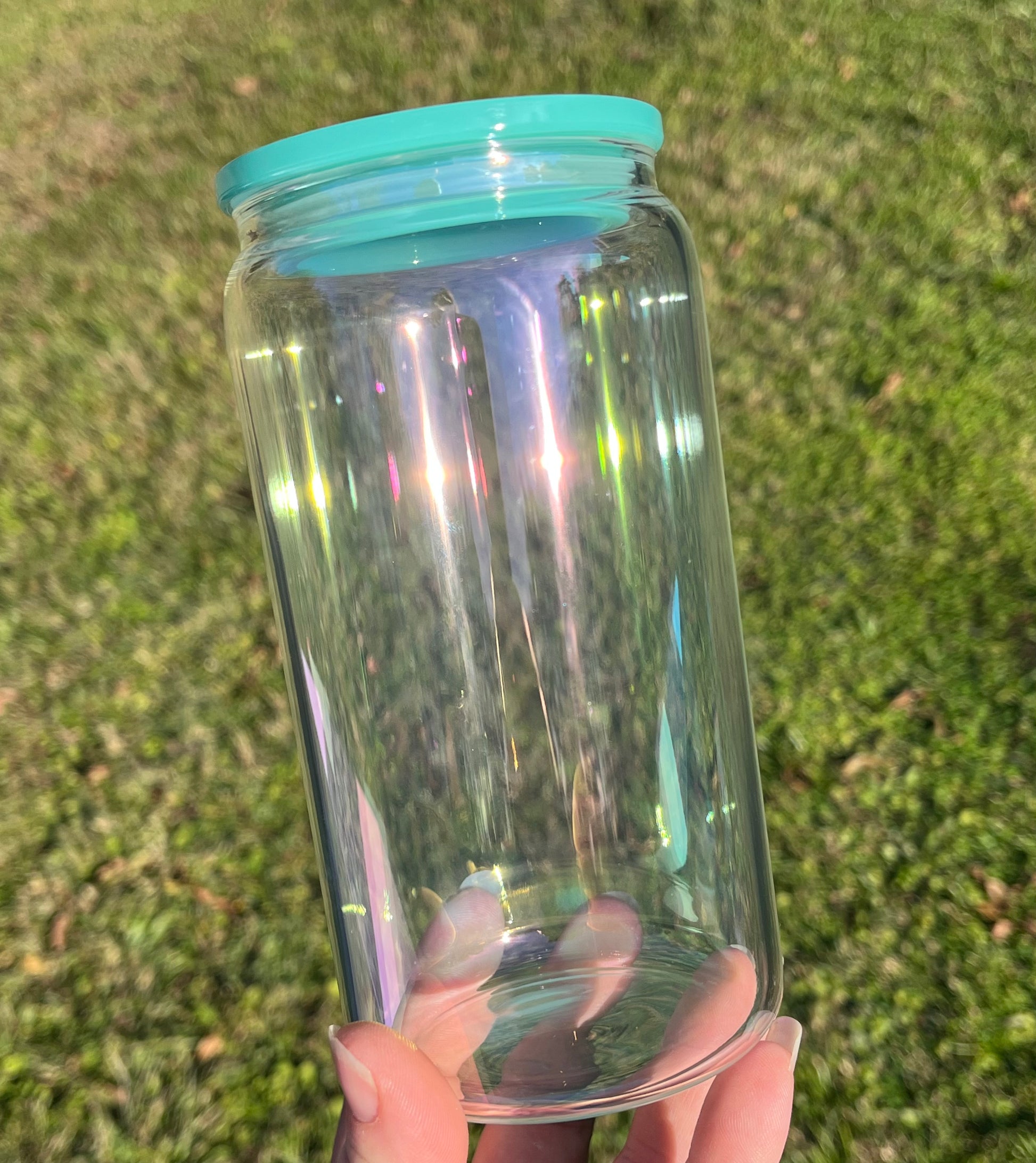 16oz rainbow glass baby green, plastic lid with straw. This item is available for a UV DTF wrap sold separately.