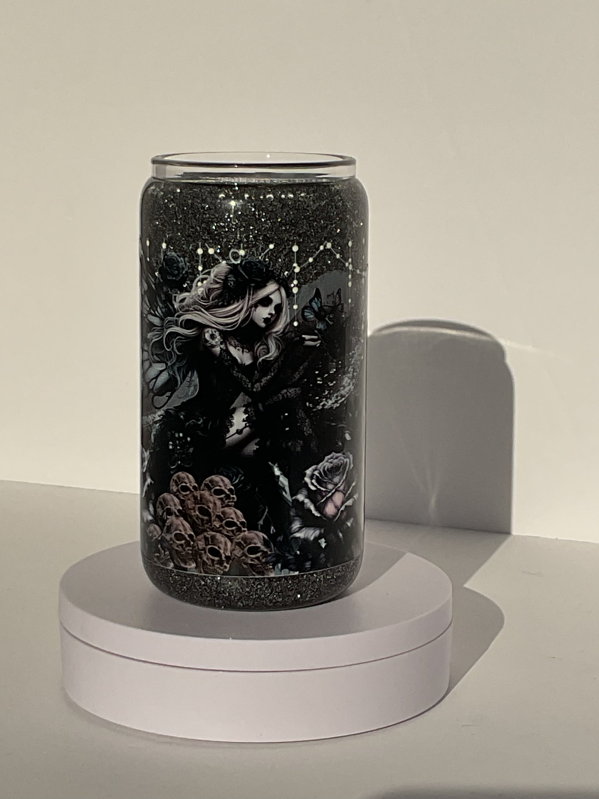 Dark silver fine glitter. Slow flow. Glass cup includes lid and straw.