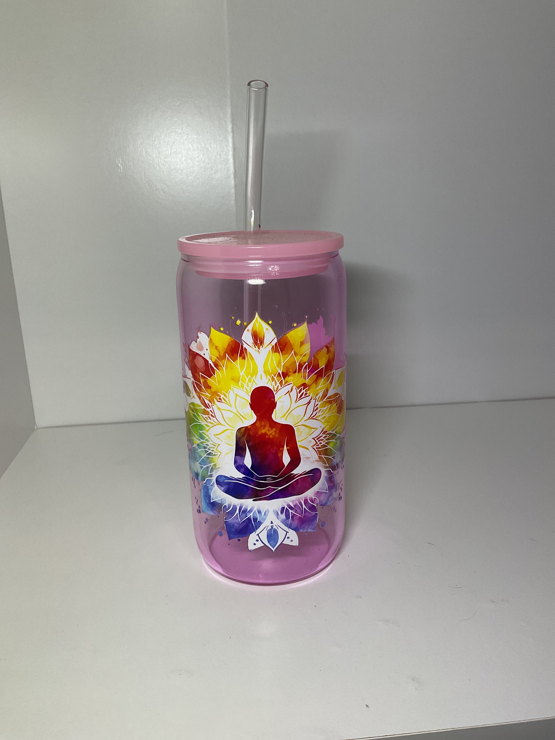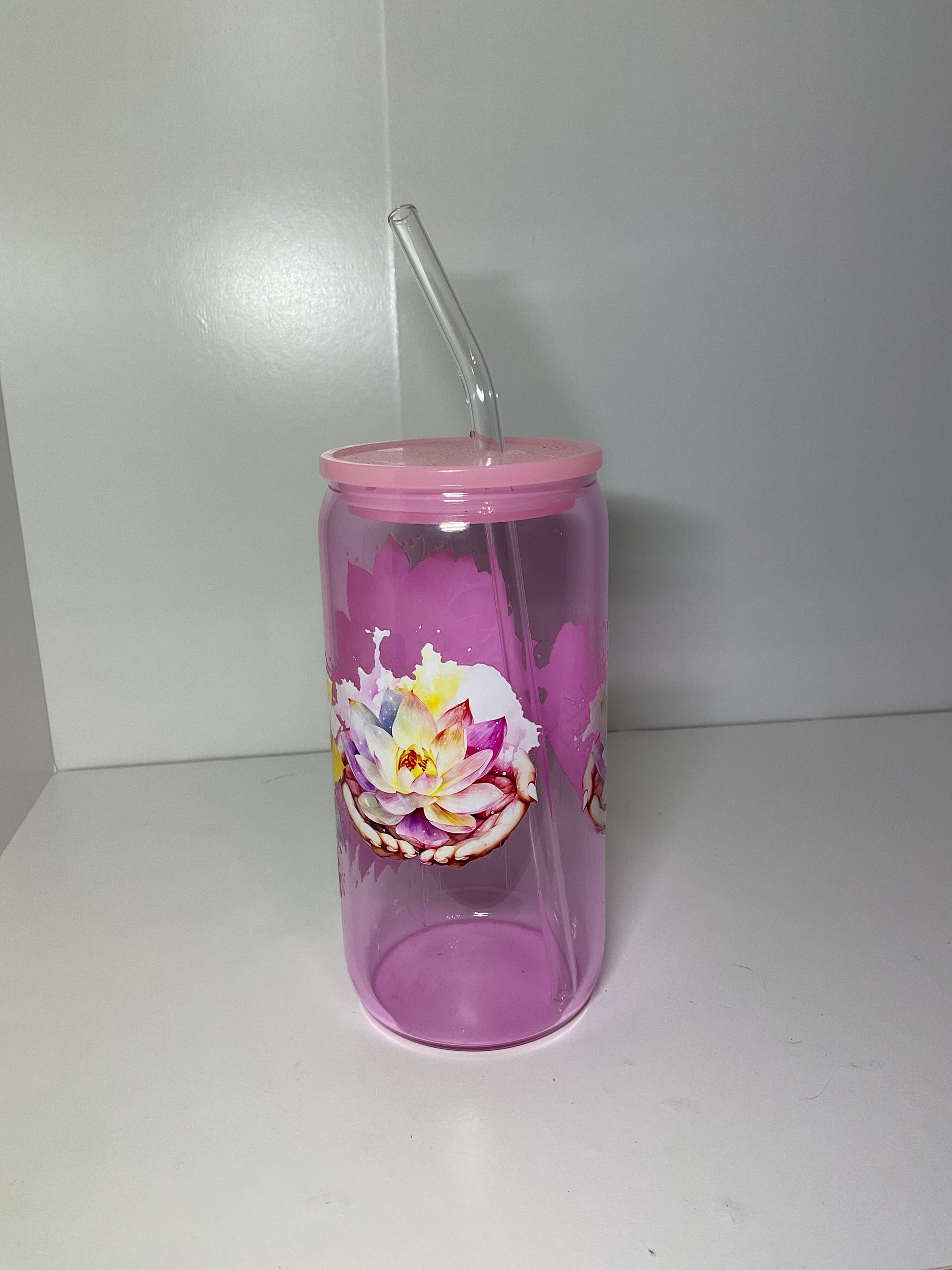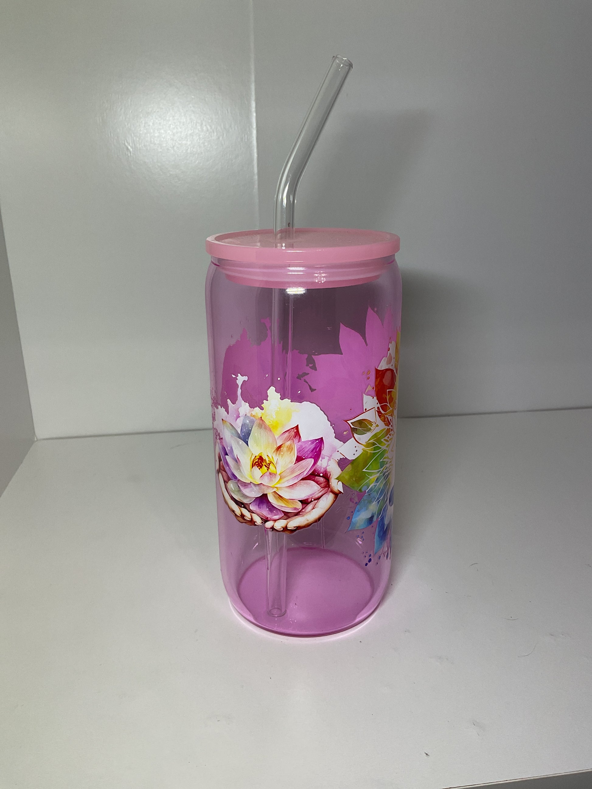 16oz glass cup with lid and straw.