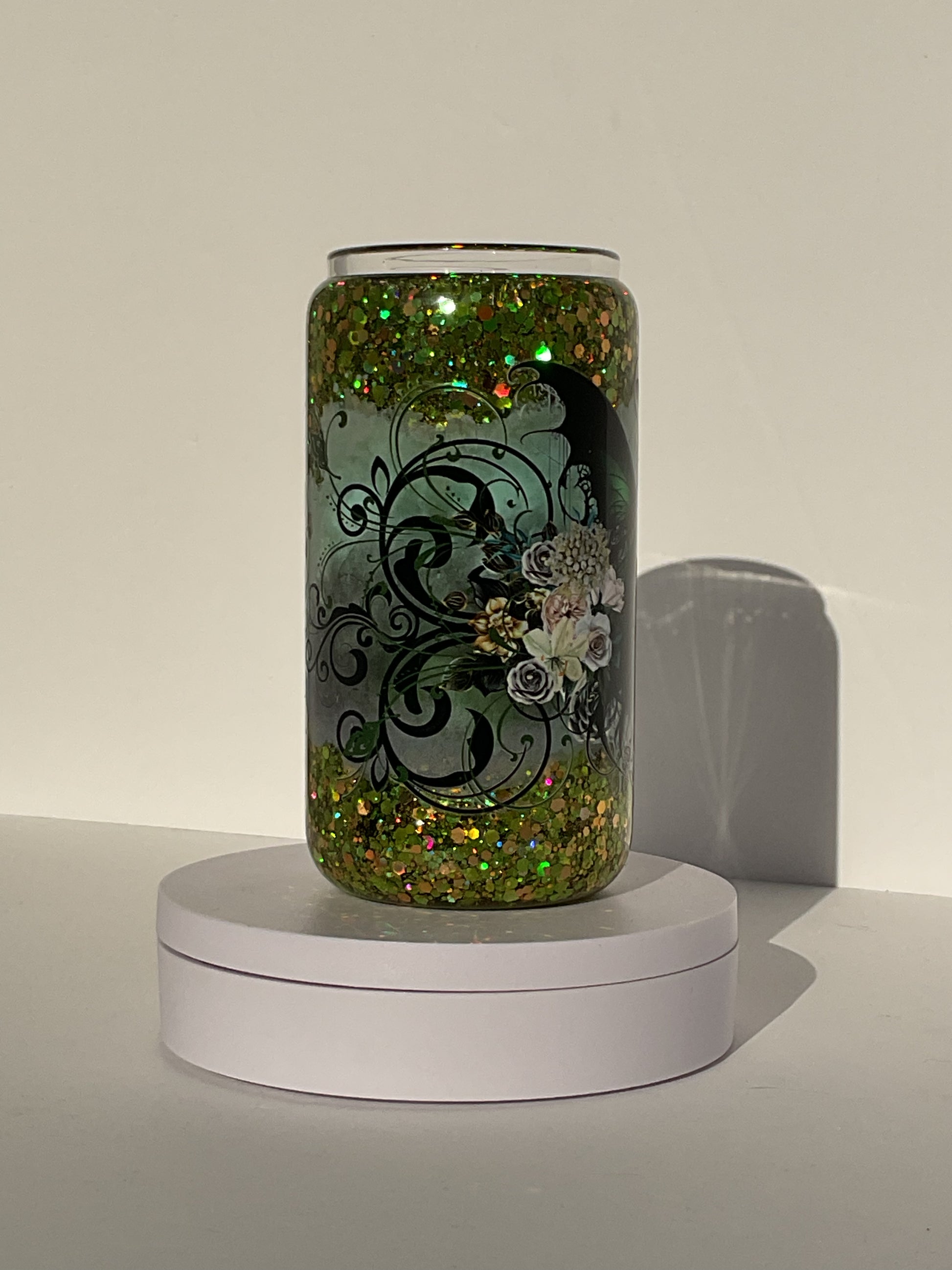 Green fairy light green chunks glitter. Slow flow. Glass cup includes lid and straw.